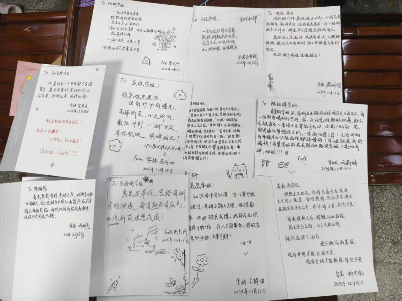 “看到朋友圈里许多在外地实习的师兄师姐,既要工作又要备考,特别辛苦。”谈及活动初衷,学生会负责人闫胜男表示,“我们希望通过手写的温度,让他们知道,他们的努力有人看见,坚持有人喝彩。”在学生会组织下,新生们用心书写每一份祝福。没有两张贺卡完全相同。有的用工整字迹写下长长鼓励,有的用彩笔画上阳光与鲜花,还有的巧妙加入俏皮的表情符号,每一笔都是青春心意的真诚流露。