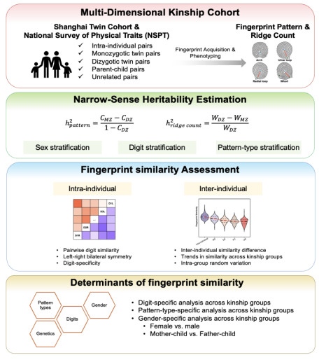 指纹具有高遗传性与发育稳定性,是复杂多基因性状的典型代表。虽然每个人的指纹具有唯一性,但生物学亲属间存在可测量的相似性,提示其具备亲缘推断的潜力。然而,针对不同亲缘程度、不同手指及不同纹型下指纹相似性如何变化的系统量化框架,长期以来仍属空白,成为法医遗传学领域的前沿科学问题。