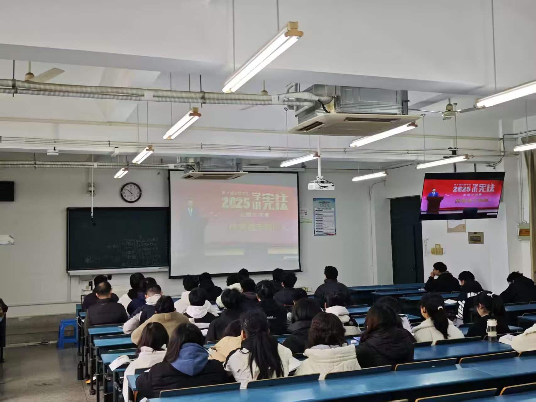 活动期间,学院组织师生集体观看了“国家宪法日”宪法晨读直播。庄严的仪式、铿锵的诵读,让在场师生深刻感受到宪法的权威与力量。随后播放《宪法伴我们成长》歌曲,师生围绕如何弘扬宪法精神展开热烈研讨,进一步强化了未来法治工作者的使命担当。